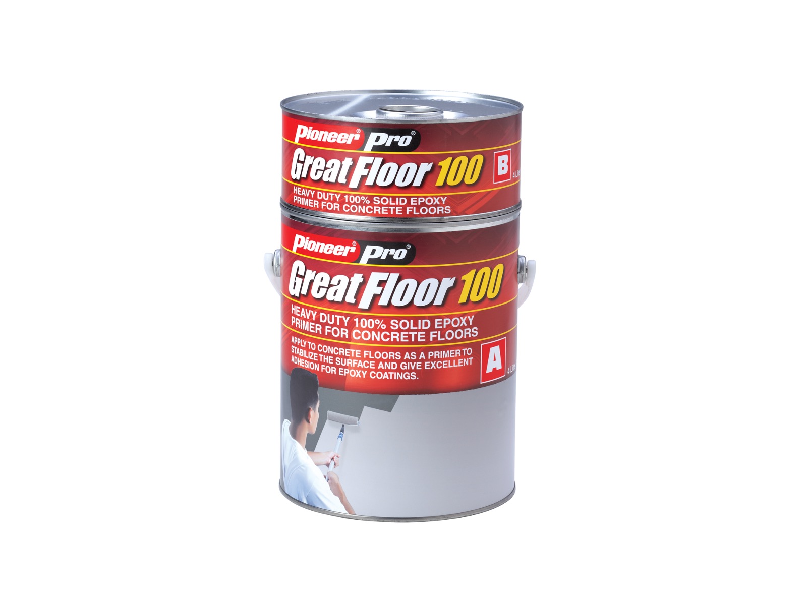 Pioneer Pro Greatfloor 100 is a two-component, 100% solid epoxy specially formulated as a high strength binder for ise in light to heavy-duty seamless floor overlay and topping systems. This floor coating primer has a low viscosity for good penetration into concrete and uniform wetting of filler aggregates.