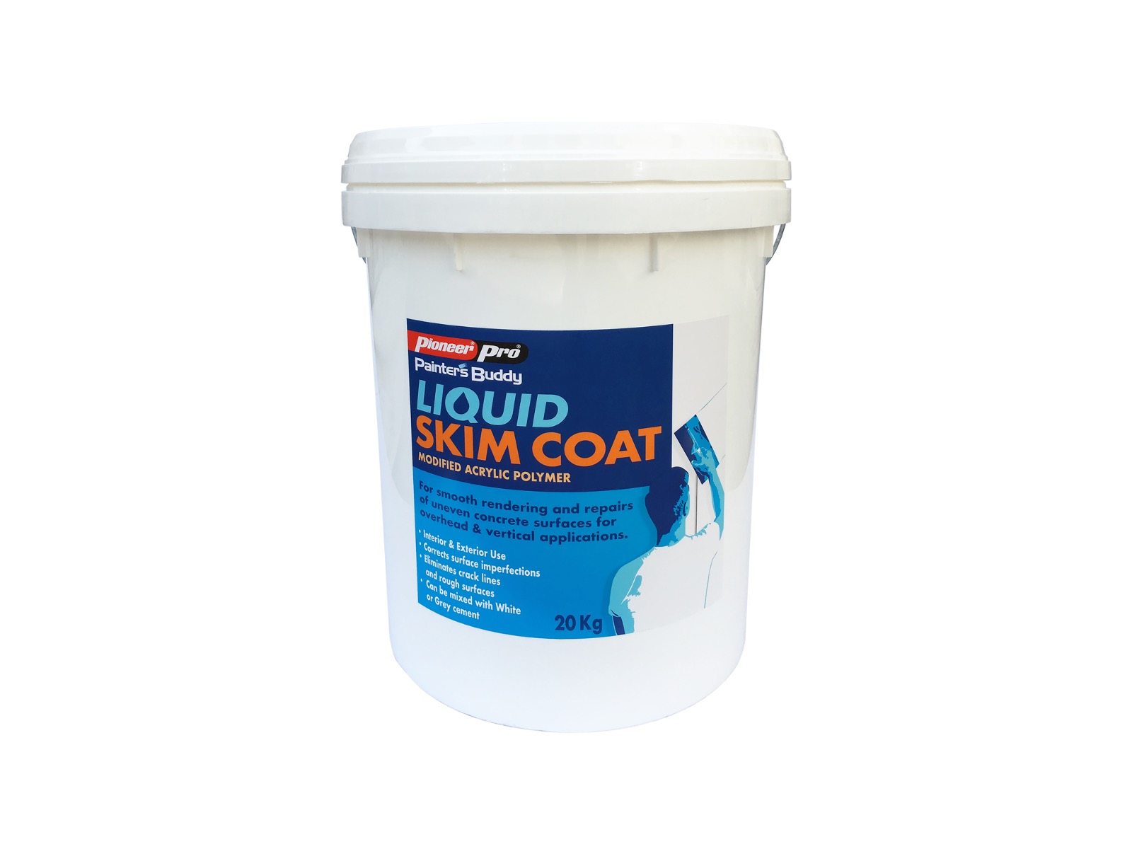 Pioneer Pro Liquid Skim Coat is a 100% acrylic smoothing rendering paste to be mixed with cement (gray or white) for repairing uneven surfaces and filling small bubbles in concrete surfaces prior to painting.